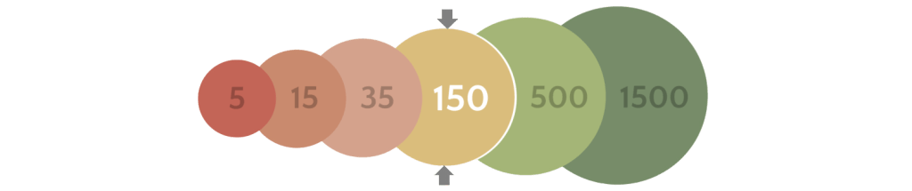 | Por camadas 5 pessoas: o círculo mais íntimo; 15 pessoas: amigos muito próximos; 50 pessoas: amigos com quem se é amigável e se convive bem. 150 pessoas é o número total de relacionamentos sociais que se consegue acompanhar com alguma conexão real. . 5 personoj: la plej intima rondo; 15 personoj: tre proksimaj amikoj; 50 personoj: amikoj, kun kiuj oni estas amikeca kaj bone interagas. 150 personoj estas la tuta nombro de sociaj rilatoj, kiujn oni povas sekvi kun iu reala interkonekto. |